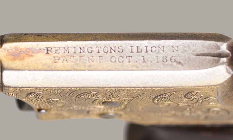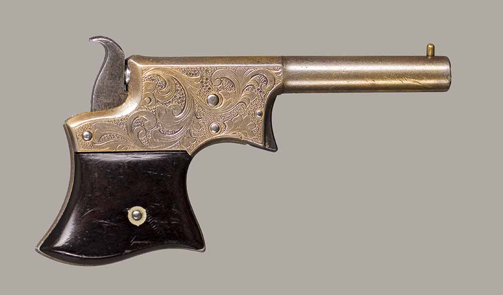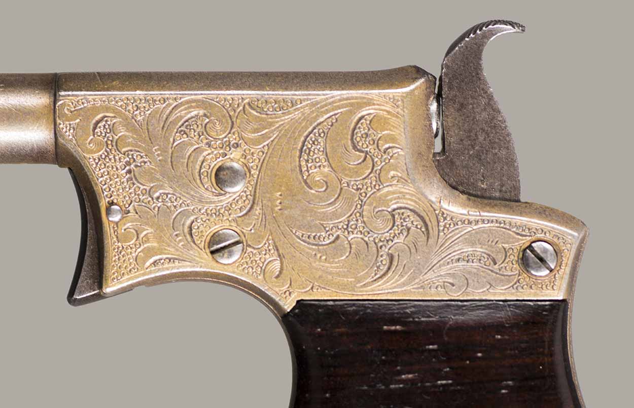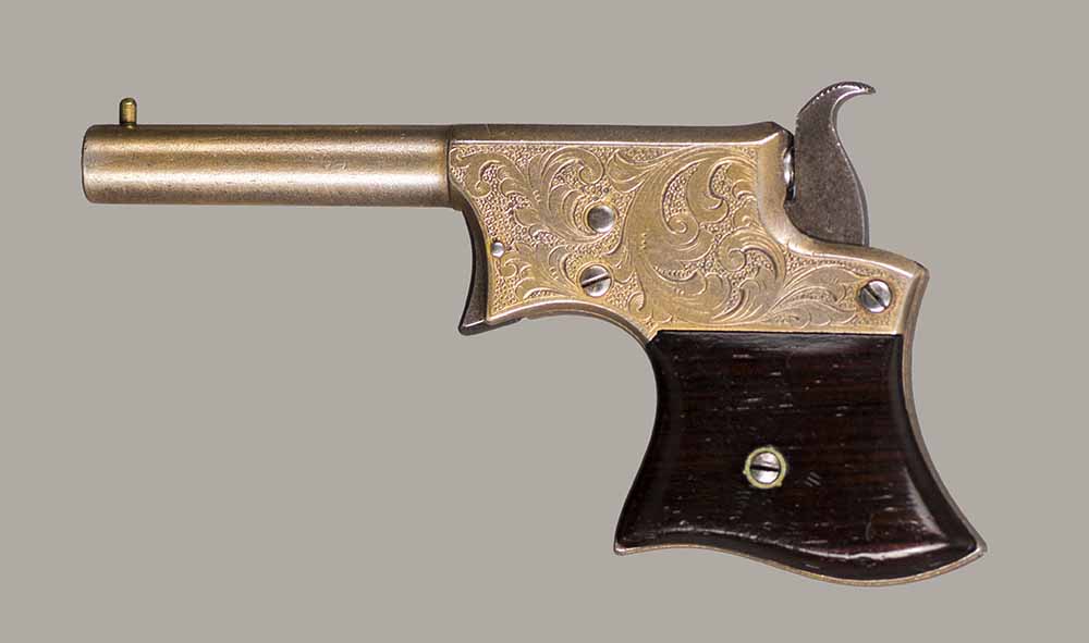 #13921. Cal. 22 Short Rim Fire. Single shot. 3 1/4 " Barrel. Model No.1 Vest Pocket, also called "Saw Handle Deringer". Factory engraved, gold gilded finish. 90% of the original finish is remaining. This type is very rarely seen engraved and gold gilded. Engraving features delicate floral bouquets on each side. Sharp markings. Mechanically perfect, rosewood grips in excellent condition. Bore is excellent. A total production of about 17.000 to 20.000, manufactured between 1863 and 1888. Excellent overall condition. Cartridges shown for information purposes only.