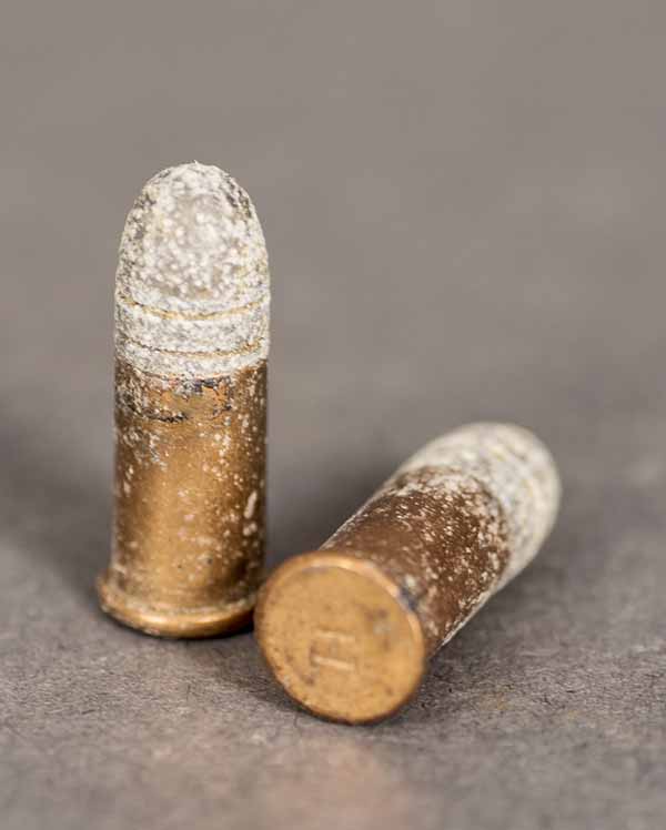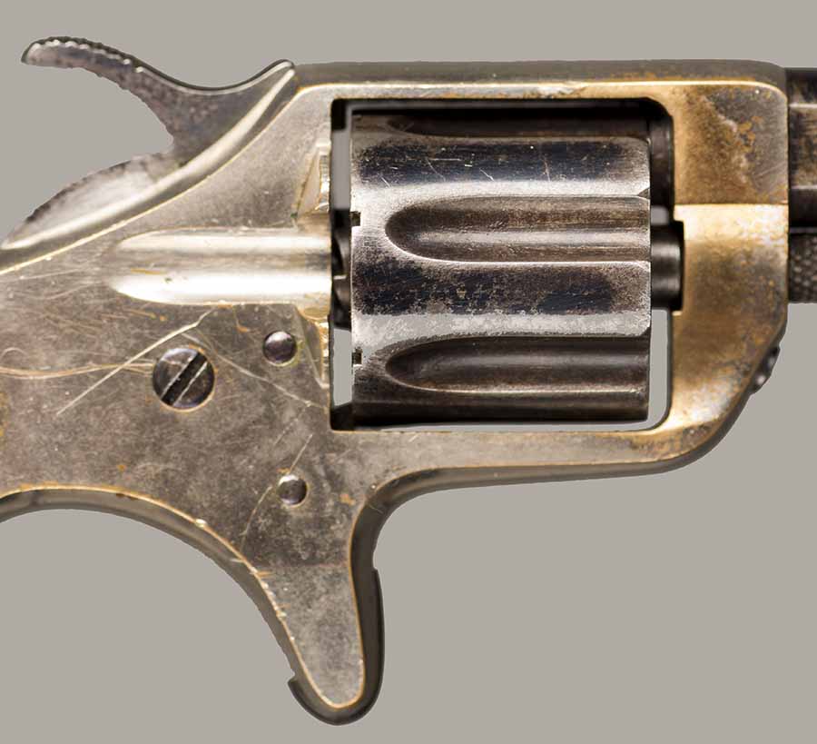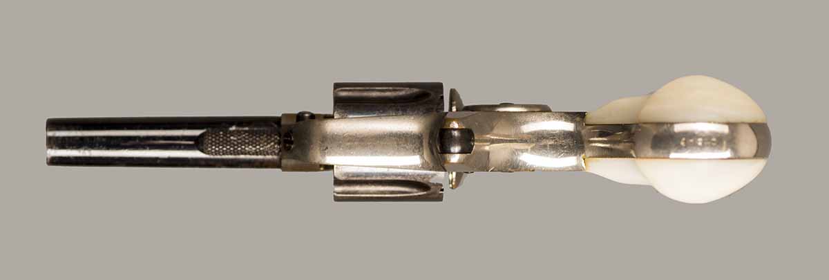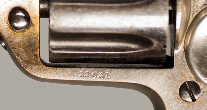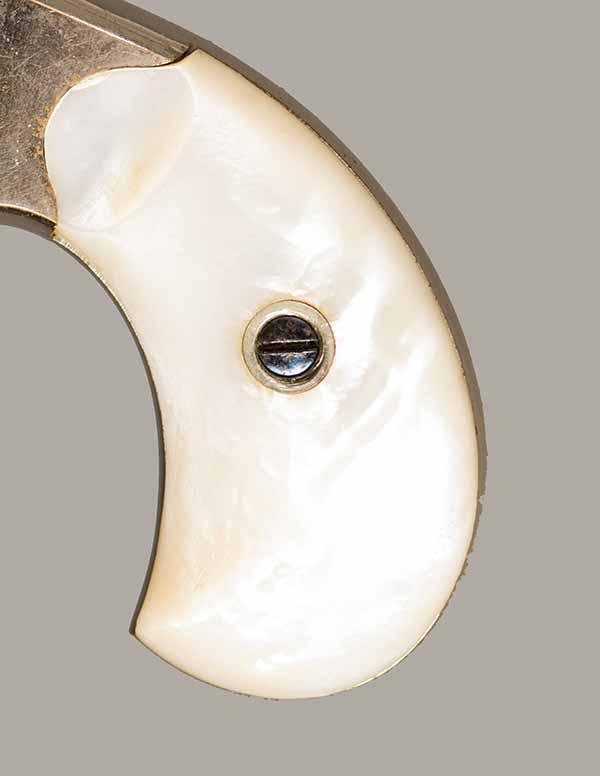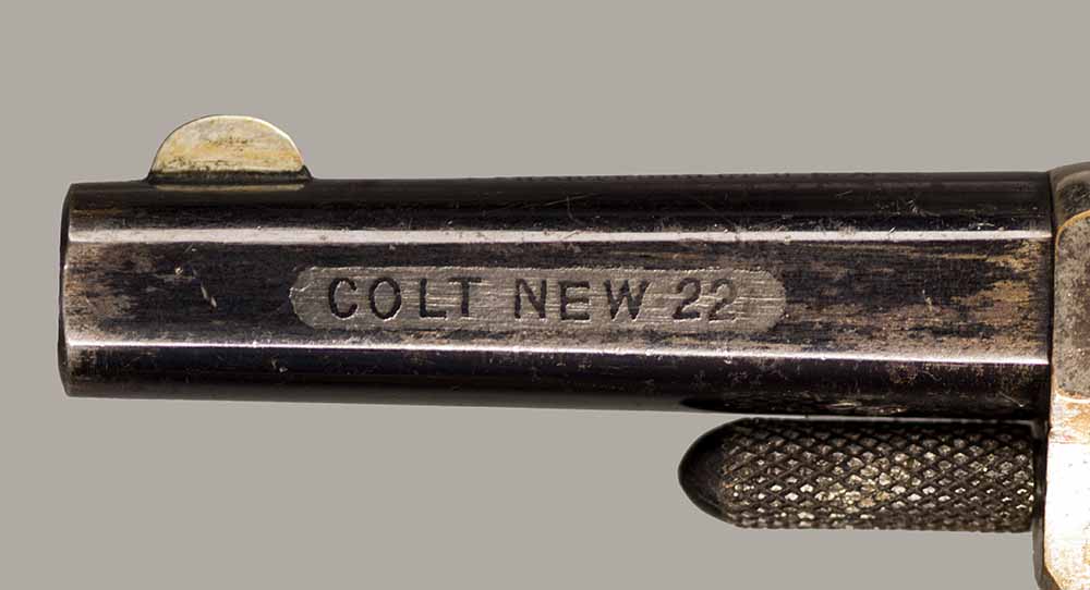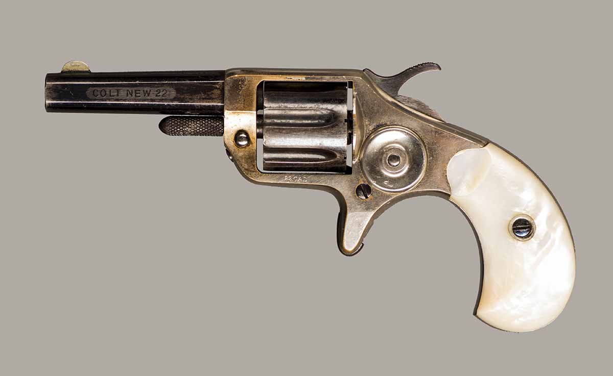 #46615. Cal. 22 Rim Fire. 2 1/4" Barrel. 7 shot cylinder. Second model with long cylinder flutes, locking slots on cylinder back and patent date stamped on barrel. Nickel/Blue finish. Has 90% of the original finish remaining. Comes with beautifull pearl grips. Perfect "COLT NEW 22" etched panel on left side of barrel. Standard Colt address on top of barrel, Patent is visible under the barrel. Mechanically perfect, with a very fine bore and seven near new chambers in the cylinder. Matching serial numbers. Made in 1877. Total production of the second model is about 39.000. Excellent overall. Cartridges shown for information purposes only.