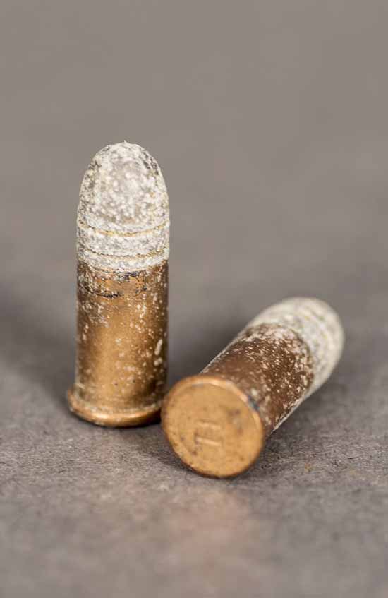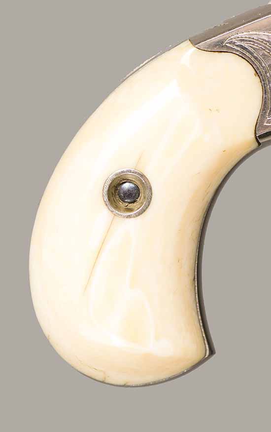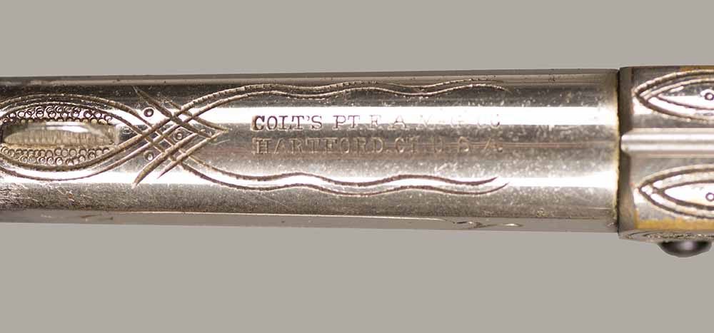 #19350. Cal. 22 Rim Fire. 2 1/4" Barrel. 7 shot cylinder. Second model with long cylinder flutes, locking slots on cylinder back and patent date stamped on barrel. Standard pattern factory engraving , nickel finish. Has 99% of the original finish remaining. Comes with beautifull ivory grips. Engraved .22 caliber New Line pistols were nearly always fitted with ivory or pearl grips. Perfect "COLT NEW 22" etched panel on left side of barrel. Standard Colt address on top of barrel. Patent is visible under the barrel. Matching serial numbers. Mechanically perfect, with a excellent bore and seven near new chambers in the cylinder. Made in 1876. Total production of the second model is about 39.000. Excellent overall, would be difficult to improve! Cartridges shown for information purposes only.
