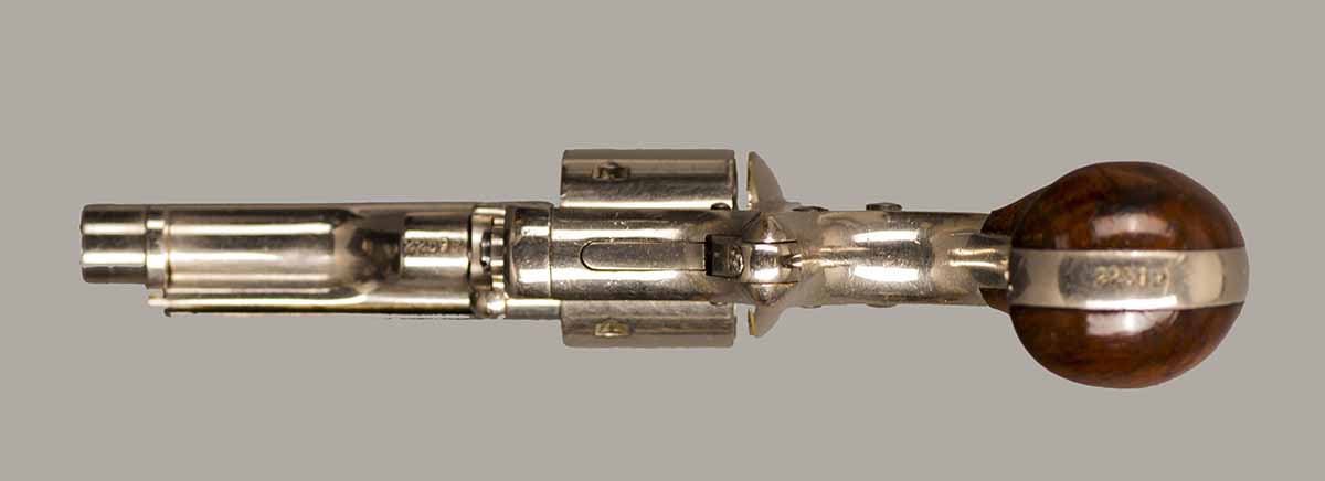 #2259P. Cal. 22 SH/L Rim Fire. 2-3/8" Barrel. 7 shot. Retains 99% of the original full nickel finish. Early "First Model" "WITH" integral ejector and "HIGH" hammer. Varnished walnut grips (Left grip has a hairline crack that is hardly noticable). First type of barrel address marking. Barrels were initially manufactured with or without integral ejctor, this design was discontinued in the serial range #3000 to #3500! Mechanically perfect, bore and cylinder chambers are as new. Matching serial numbers. Made in 1871, first year of production! Total quantity of 114.200. Rare gun in near mint condition.