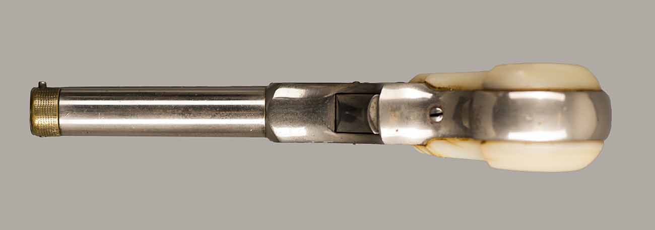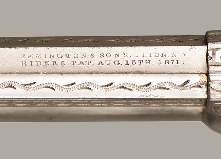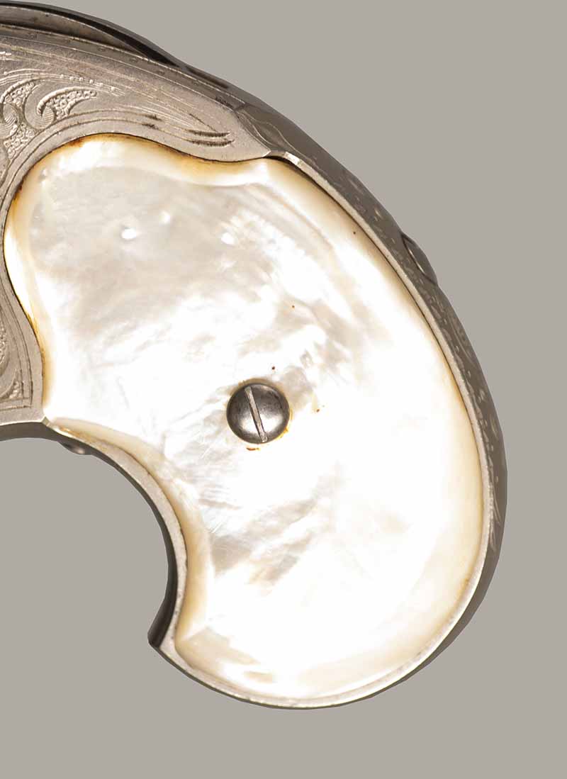 This model was not serial-numbered. Cal.32 RF Extra Short. 5 Shot. 3" Octagon Barrel. The gun is "fully factory" engraved and has special order "thick pearl grips" in new condition. Retains 99% of original overall finish. 5 shot magazine located under the barrel. Mechanically perfect and has a bright shiny bore. This Joseph Rider invention is one of the most unusual of 19th. century pocket pistols and one of the first metallic cartridge weapons using a tubular magazin. Total production of about 13.000, manufactured from 1871 to 1888. Yearly production for this model is not known. Near mint condition! Almost impossible to improve! Great looking gun. Cartridges shown for information purposes only.