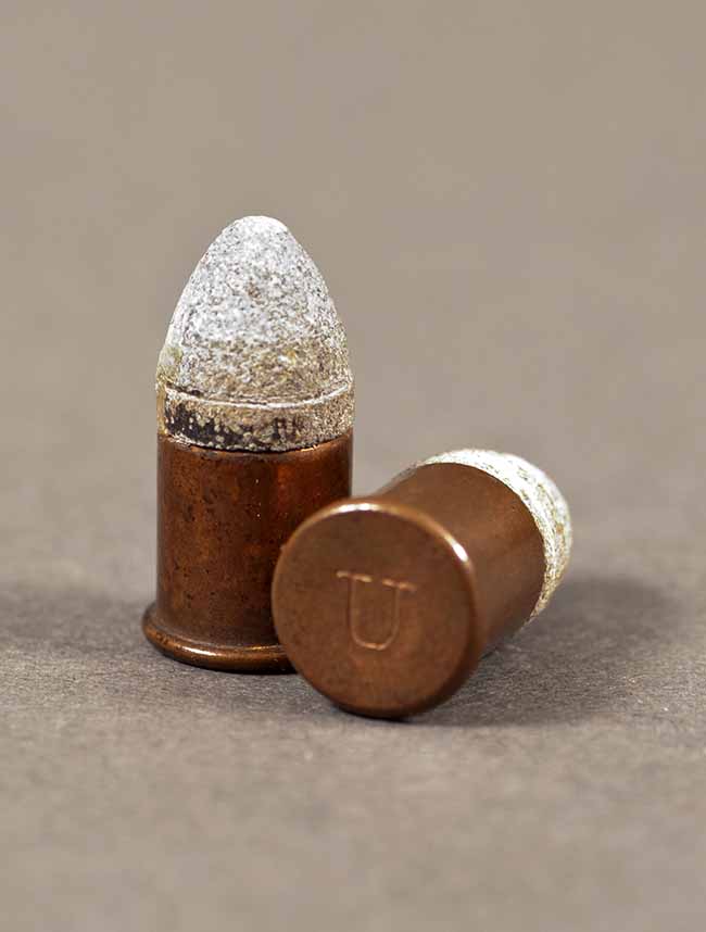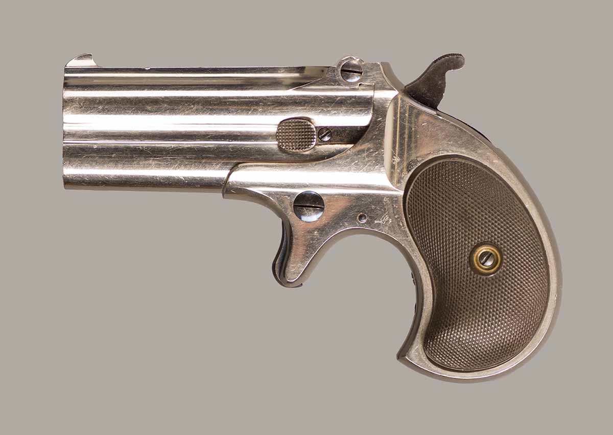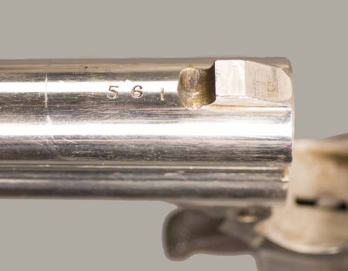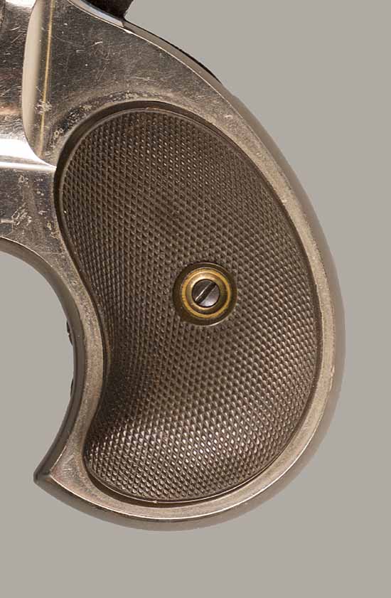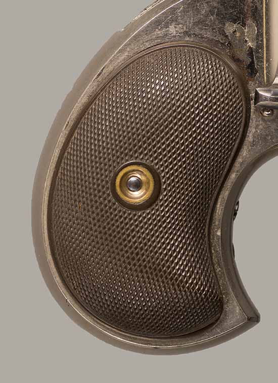 #561. Cal. 41 Rimfire. Standard 3" Barrel. Third Model. Slanted line barrell address! Retains 99% of the original nickel plated finish. Hammer has 98% blue. Correct and perfect black checkered hard rubber grips. Matching serial numbers! Mechanically perfect, bores are excellent. Gun has perfect hinges! Made cc.1888. About 67.000 to 70.000 made. Beautifull deringer in a near mint condition. Would be hard to improve! Cartridges shown for information purposes only.