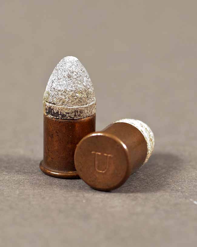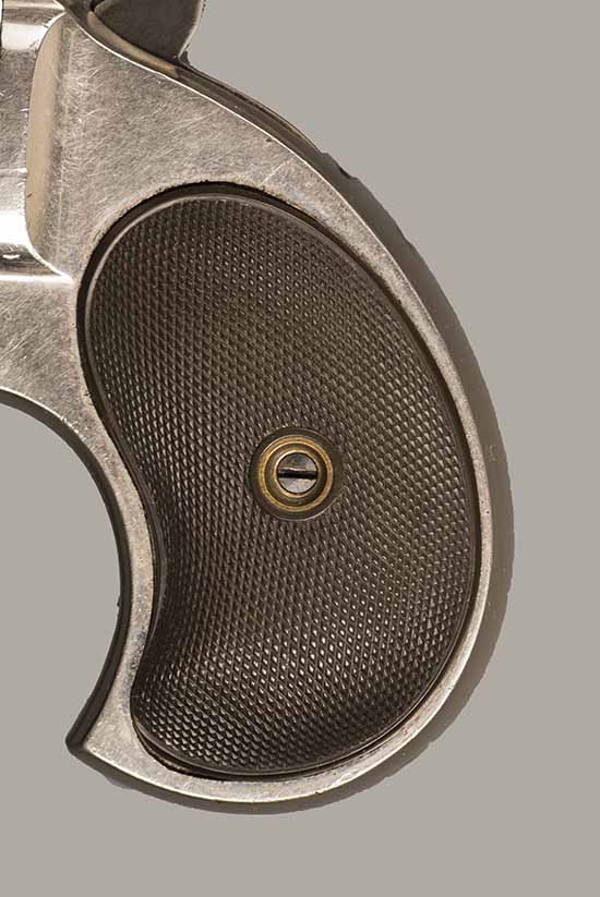 #36. Cal. 41 Rimfire. Standard 3" Barrel. Third Model, third type. Long line signing barrell address! Retains 99% of the original nickel plated finish. Hammer has 98% blue. Correct and perfect black checkered hard rubber grips. Matching serial numbers! Mechanically perfect, bores are excellent. Gun has perfect hinges! Made cc.1888. About 67.000 to 70.000 made. Beautifull deringer in a near mint condition. Would be hard to improve! Cartridges shown for information purposes only.