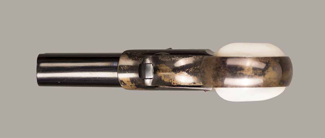 #54. Cal. 41 Rimfire. Standard 3" Barrel. Third Model, third type. Long line signing barrell address! Retains 90% of the original blue finish. Hammer has 98% blue. Correct and perfect pearl grips! Matching serial numbers! Mechanically perfect, bores are excellent. Gun has perfect hinges! Made cc.1888. About 67.000 to 70.000 made. Beautifull deringer in excellent + condition. Cartridges shown for information purposes only.