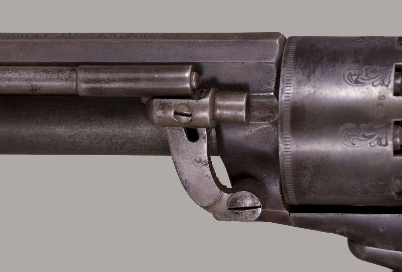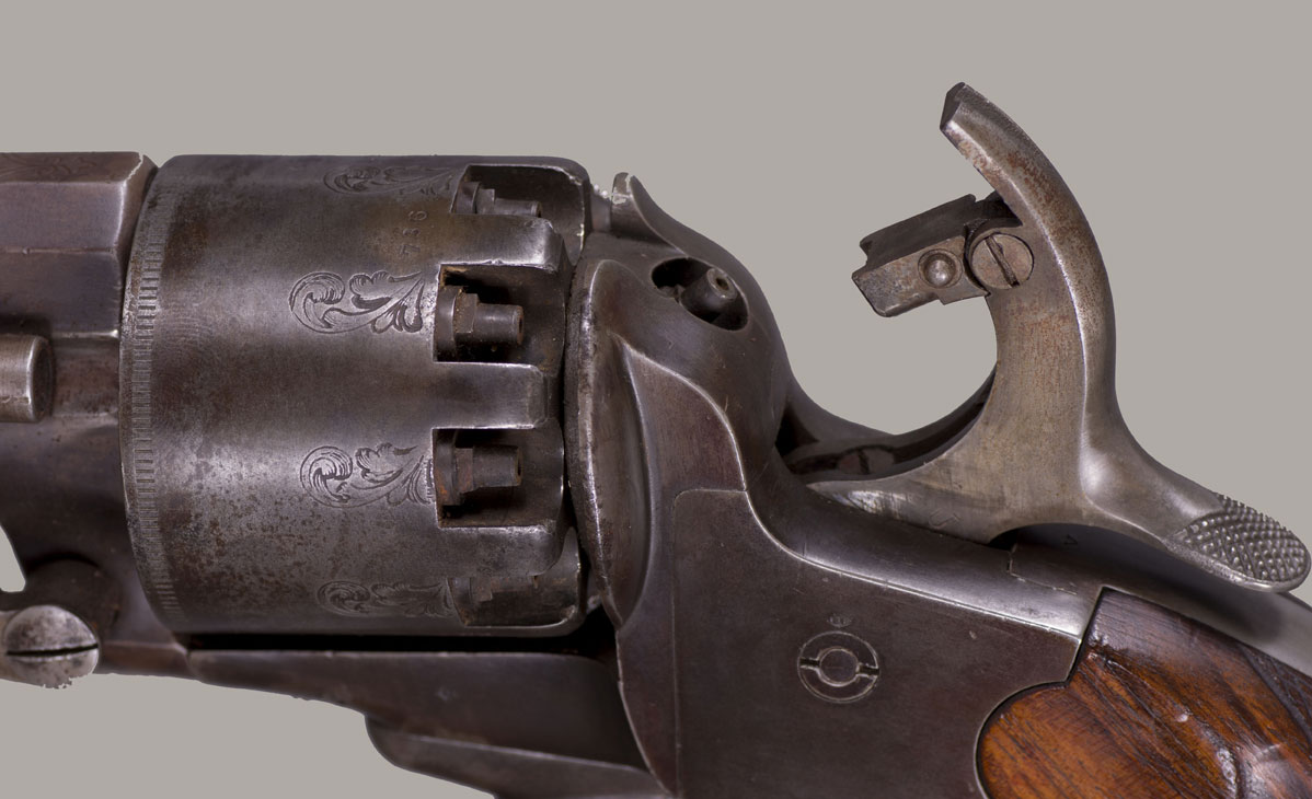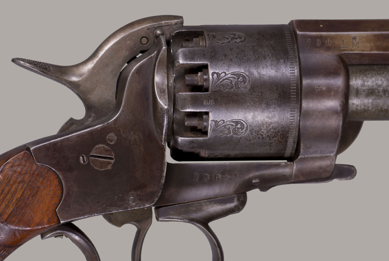 #736. Caliber 42 percussion, 9 shot round cylinder with 6 6/8" barrel, and a 63 caliber (20 gauge for buckshot) 5” barrel. Made by C. Girard in Paris, France from 1861. About 500 transitional revolvers were made and fall between serial numbers 450 and 950. The hammer has a pivoting striker that facilitates firing either the upper or lower barrel. A pivoted loading lever is attached to the left side of the frame and secured along the side of the upper barrel. The grip has an integral flared buttcap with lanyard ring and is fitted with two-piece, fine checkered, European walnut stocks. Top of the barrel is inscribed with the second style Paris marking: "Col. Lemat Bte s.g.d.g. Paris". The right side of the barrel is marked with the LeMat trademark of a five-pointed star above the block letters "LM". The serial number is stamped on the right side of the barrel behind the trademark, on the "engraved" cylinder plus two correct digits on lever. All of the visible serial numbers match. All inspector marks also present and correct. Mechanically perfect. The bore is in excellent condition, so are the cylinder chambers and the shotgun bore! The LeMat was popularly known as the "grapeshot revolver" because of the 20 gauge shot barrel. About 2,900 LeMat revolvers were manufactured between 1856 and 1865, of which 2000 were second models. LeMat revolvers are rare and are very desirable Civil War era revolvers. About 1500 LeMat revolvers were purchased by the Confederate government during the Civil War. LeMat revolvers were carried by prominent Confederate officers such as General J.E.B. Stuart and General P.G.T. Beauregard. The LeMat two-barrel revolver is the most distinctive of all Confederate associated firearms. This revolver was made in 1862. An essentially all original and complete example of a scarce and desirable gun. Fine condition!! We have never had a better one!