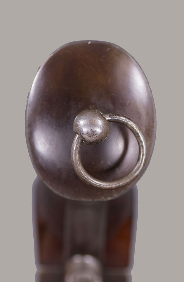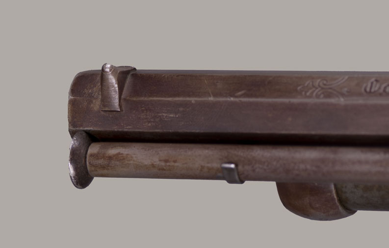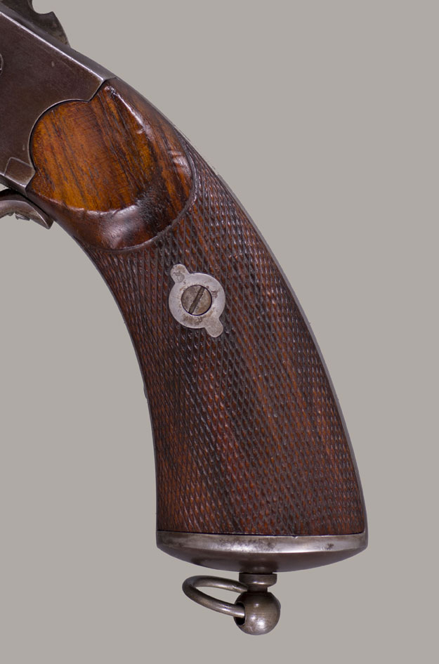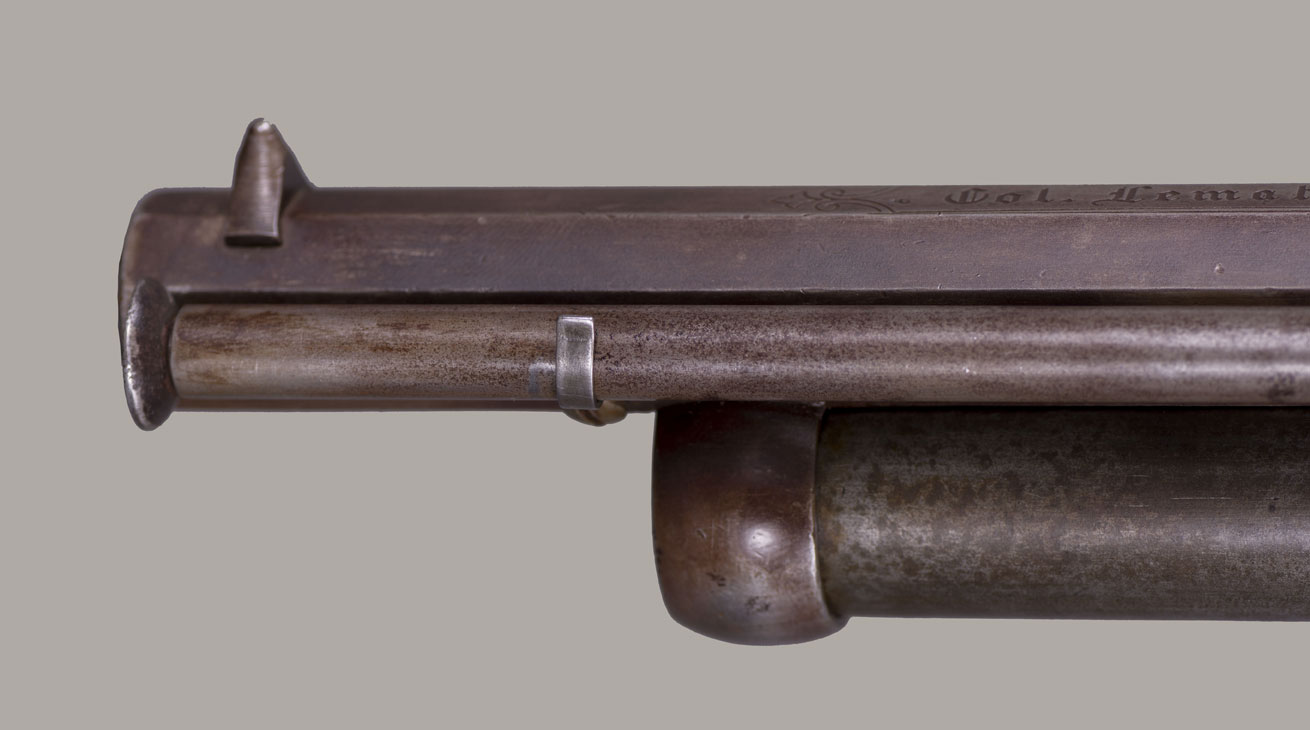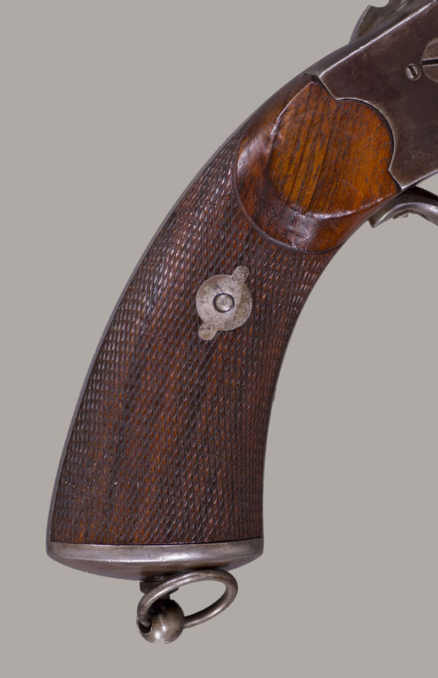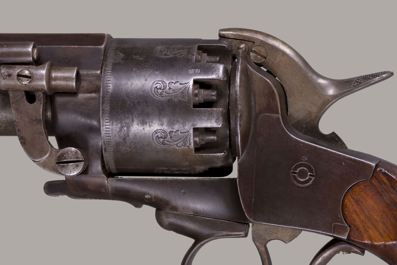 #736. Caliber 42 percussion, 9 shot round cylinder with 6 6/8" barrel, and a 63 caliber (20 gauge for buckshot) 5” barrel. Made by C. Girard in Paris, France from 1861. About 500 transitional revolvers were made and fall between serial numbers 450 and 950. The hammer has a pivoting striker that facilitates firing either the upper or lower barrel. A pivoted loading lever is attached to the left side of the frame and secured along the side of the upper barrel. The grip has an integral flared buttcap with lanyard ring and is fitted with two-piece, fine checkered, European walnut stocks. Top of the barrel is inscribed with the second style Paris marking: "Col. Lemat Bte s.g.d.g. Paris". The right side of the barrel is marked with the LeMat trademark of a five-pointed star above the block letters "LM". The serial number is stamped on the right side of the barrel behind the trademark, on the "engraved" cylinder plus two correct digits on lever. All of the visible serial numbers match. All inspector marks also present and correct. Mechanically perfect. The bore is in excellent condition, so are the cylinder chambers and the shotgun bore! The LeMat was popularly known as the "grapeshot revolver" because of the 20 gauge shot barrel. About 2,900 LeMat revolvers were manufactured between 1856 and 1865, of which 2000 were second models. LeMat revolvers are rare and are very desirable Civil War era revolvers. About 1500 LeMat revolvers were purchased by the Confederate government during the Civil War. LeMat revolvers were carried by prominent Confederate officers such as General J.E.B. Stuart and General P.G.T. Beauregard. The LeMat two-barrel revolver is the most distinctive of all Confederate associated firearms. This revolver was made in 1862. An essentially all original and complete example of a scarce and desirable gun. Fine condition!! We have never had a better one!