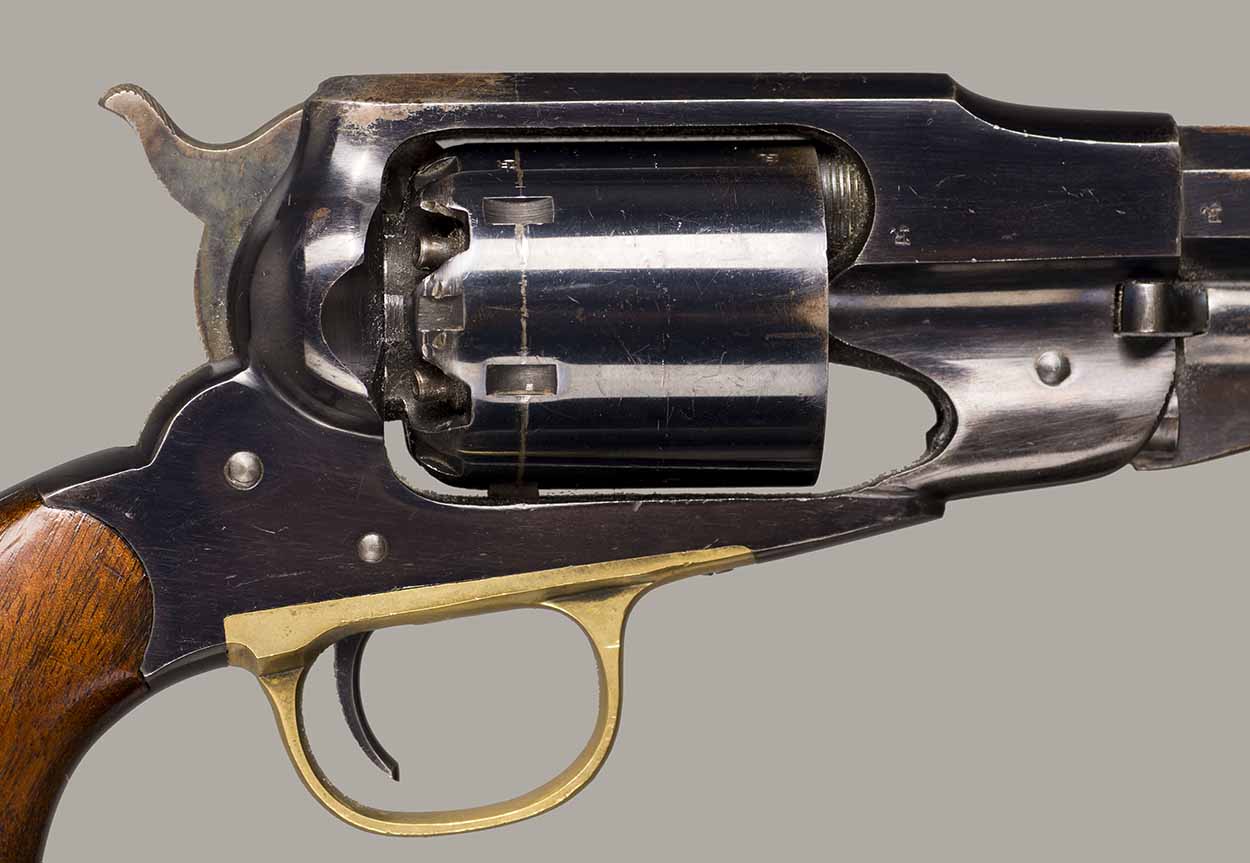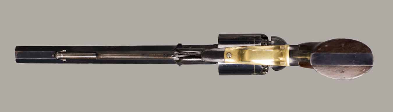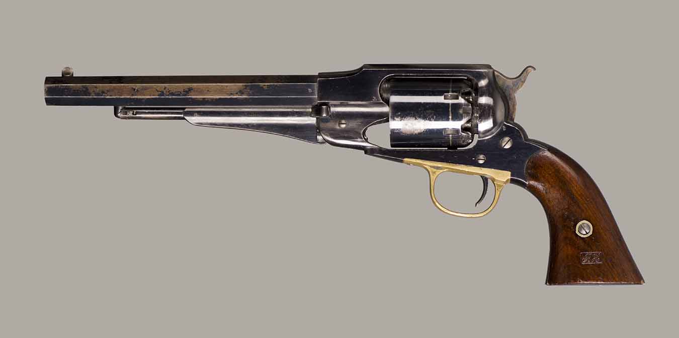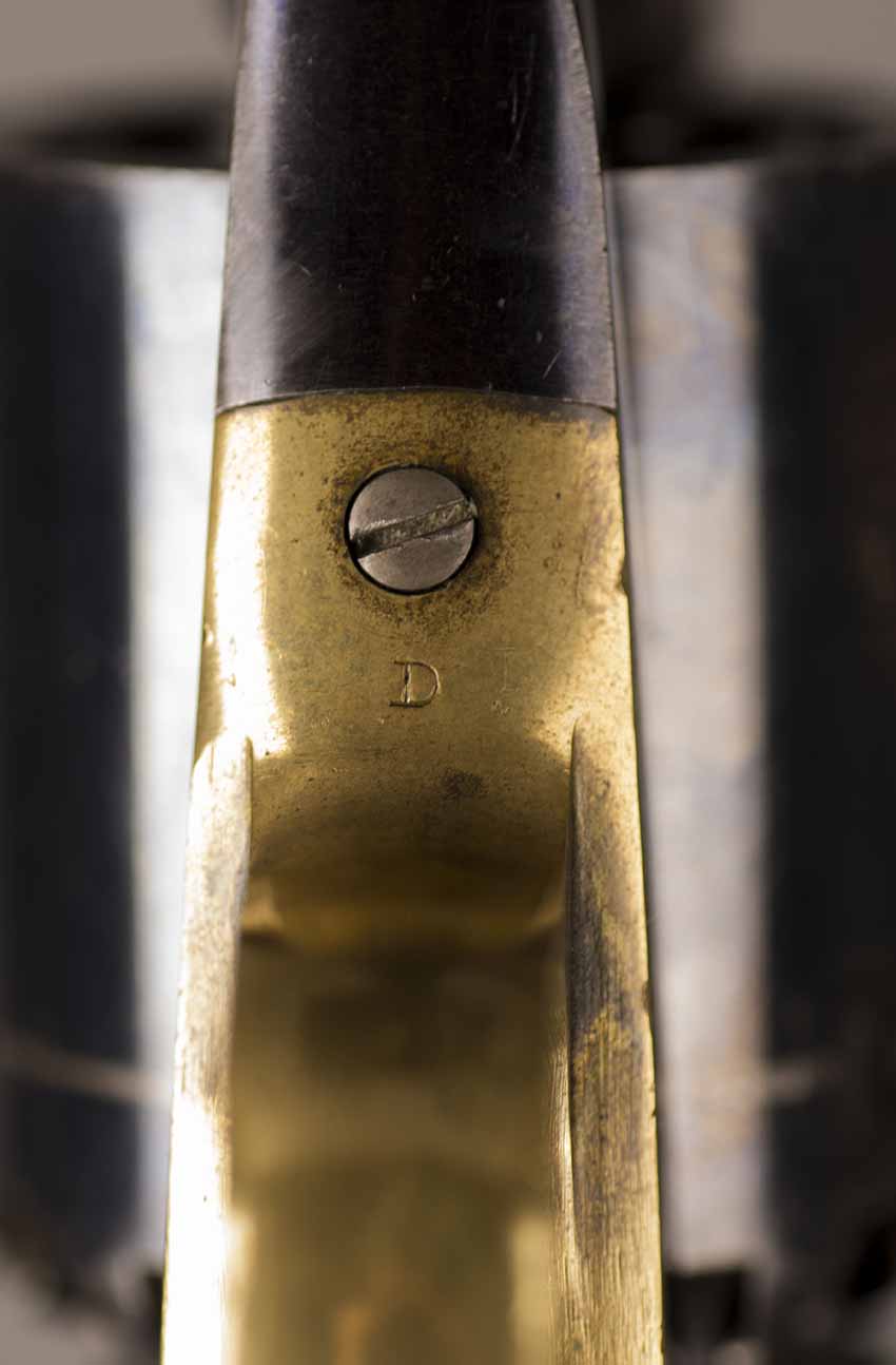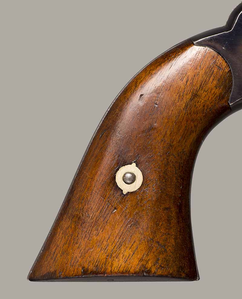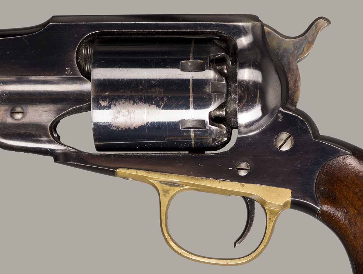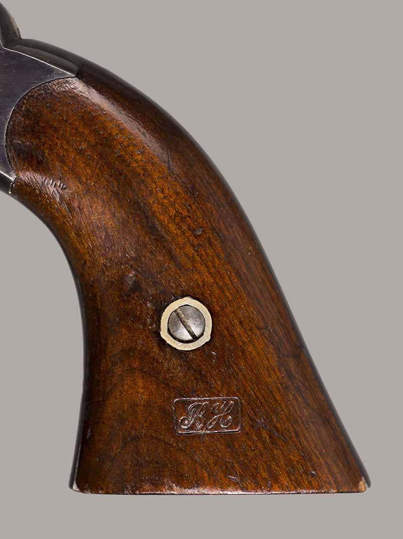 #79793. Cal. 44 percussion. Standard 8" octagon barrel. Matching serial numbers. Retains overall 90% of the original blue, the missing 10% is flaking on the barrel. Hammer has 95% of of original colour case! Standard threaded front sight. Walnut grips in perfect condition. Standard address with top line only partly visible, should read "Patented Sept.14,1858", missing part is clearly factory error, light stamping! Mechanically perfect. Has a mint bore and cylinder chambers. Left grip has a perfect military Inspector cartouche "B.H" (Benjamin Harris; Remington Principal Inspector 1864-65). Single letter Ordnance sub-inspection marks are stamped on most parts of the gun, even on the grips!. The Remington New Model Army Revolver was issued to Federal cavalry regiments during the last two years of the Civil War. Made 1863-1875 with a total production of about 122.000. These revolvers were the second most widely issued sidearms to Union forces during the Civil War, following only the Colt Model 1860 Army. This gun was made in 1864! An honest Civil War era military revolver, in near perfect condition!! One of the best we have ever offered for sale. Excellent !!