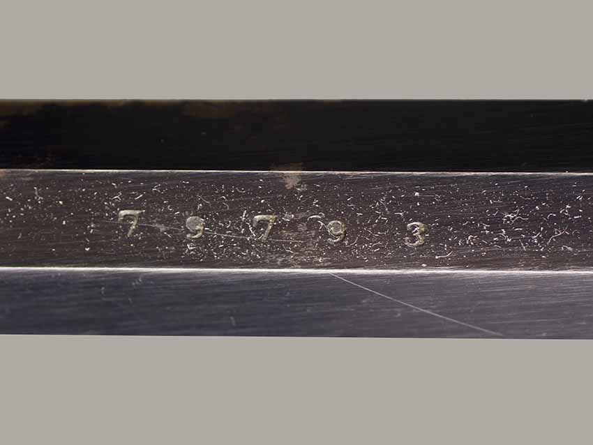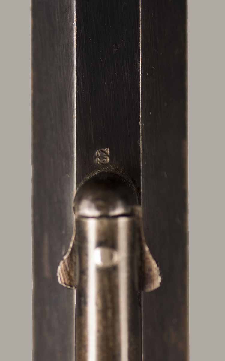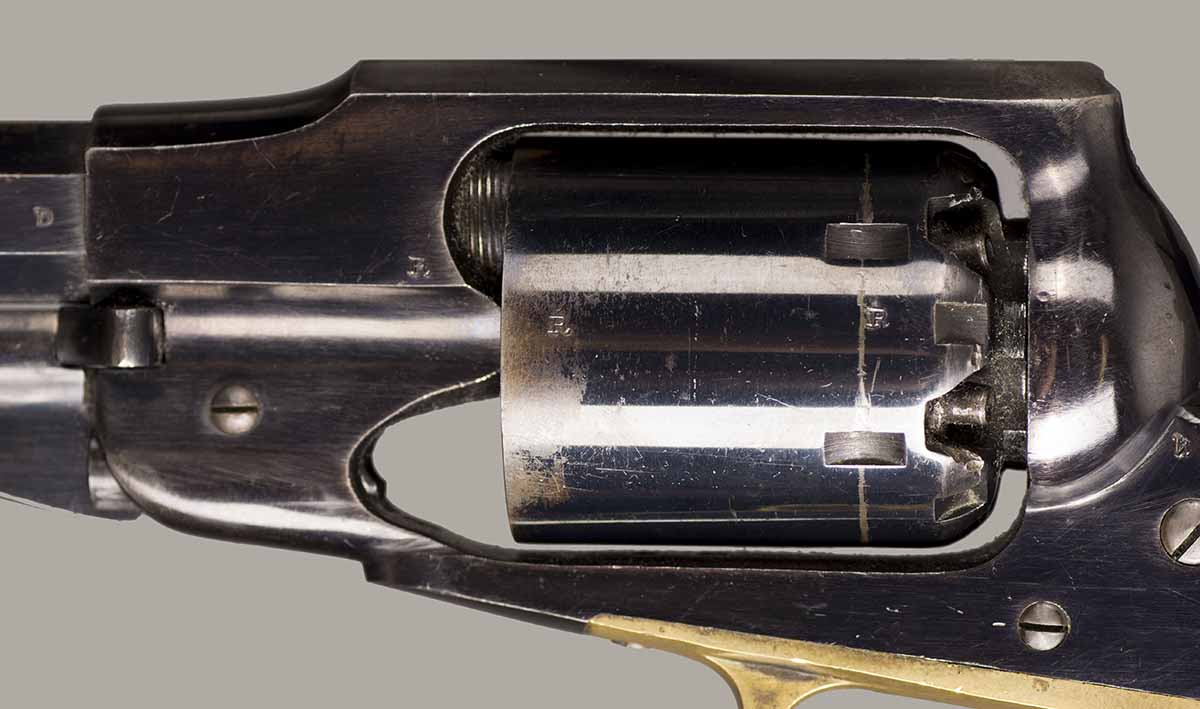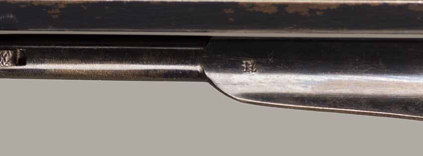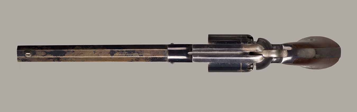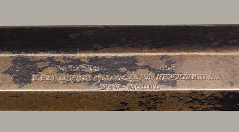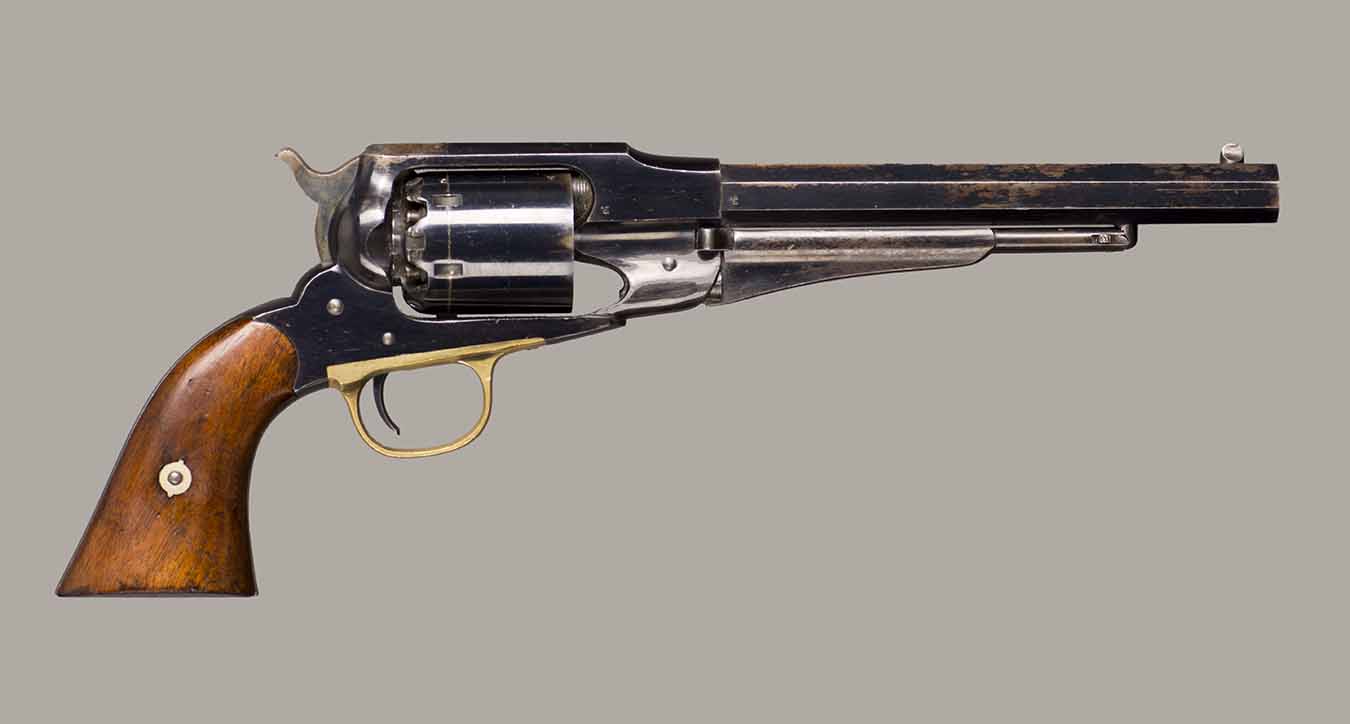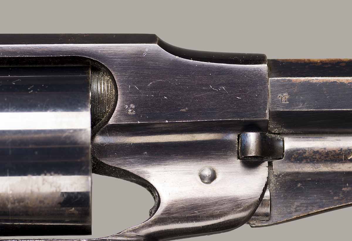 #79793. Cal. 44 percussion. Standard 8" octagon barrel. Matching serial numbers. Retains overall 90% of the original blue, the missing 10% is flaking on the barrel. Hammer has 95% of of original colour case! Standard threaded front sight. Walnut grips in perfect condition. Standard address with top line only partly visible, should read "Patented Sept.14,1858", missing part is clearly factory error, light stamping! Mechanically perfect. Has a mint bore and cylinder chambers. Left grip has a perfect military Inspector cartouche "B.H" (Benjamin Harris; Remington Principal Inspector 1864-65). Single letter Ordnance sub-inspection marks are stamped on most parts of the gun, even on the grips!. The Remington New Model Army Revolver was issued to Federal cavalry regiments during the last two years of the Civil War. Made 1863-1875 with a total production of about 122.000. These revolvers were the second most widely issued sidearms to Union forces during the Civil War, following only the Colt Model 1860 Army. This gun was made in 1864! An honest Civil War era military revolver, in near perfect condition!! One of the best we have ever offered for sale. Excellent !!