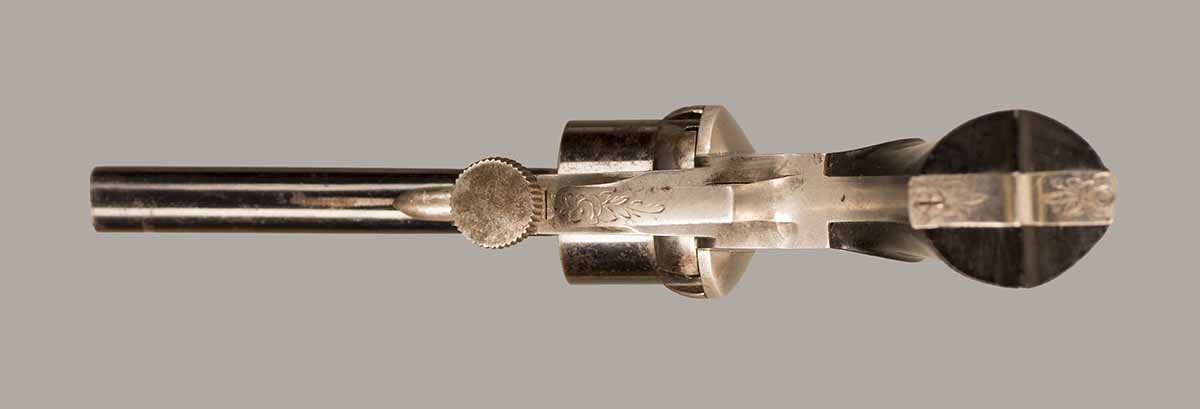 No #. Cal. 7MM. Standard 3 1/2"" Barrel. 95% of the blue finish remaining on Barrel and Cylinder. Nice engraving on frame. Mariette brevete stamped on the frame. ELG proofmark and Crowned "M" stamped on cylinder. Grips in excellent condition. Mechanically perfect. Gun was made in Liège Belgium by Servais Mariette (Son of Guillaume) around 1863. Very fine condition. Cartridge shown for information purposes only.