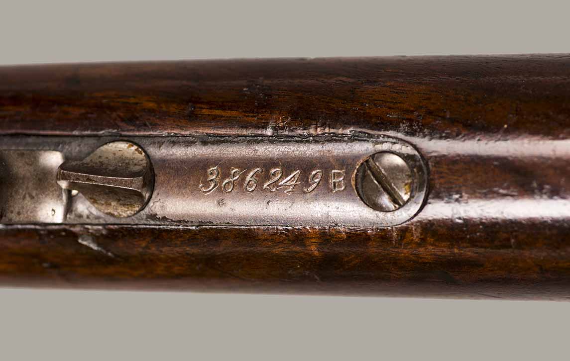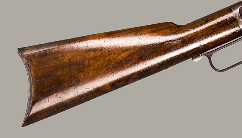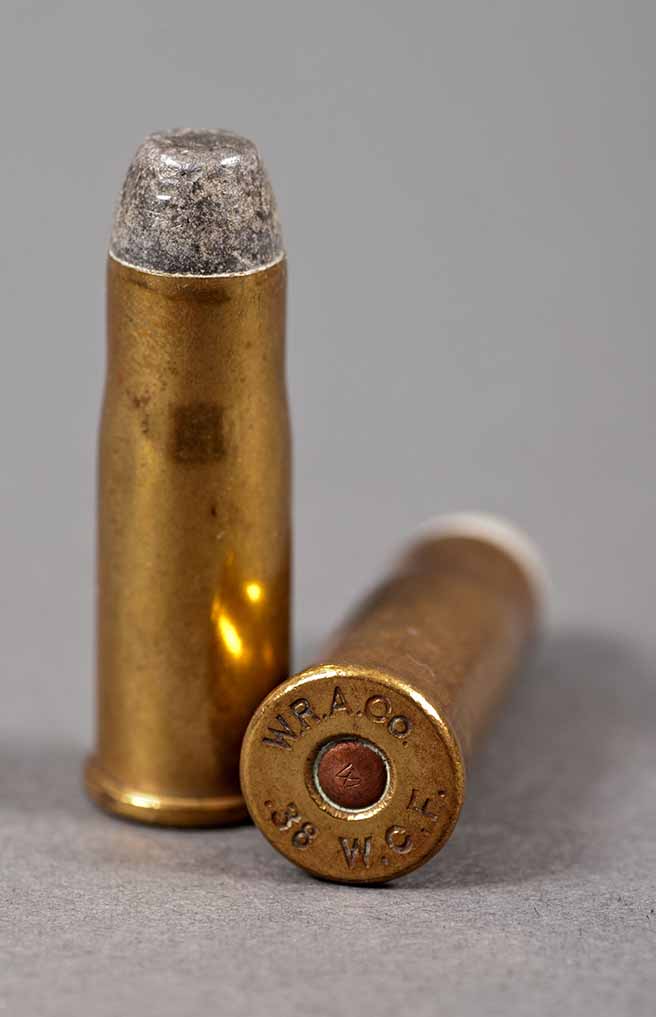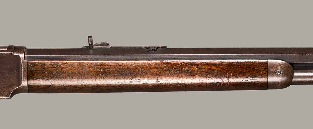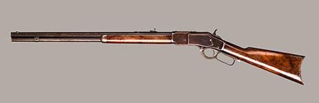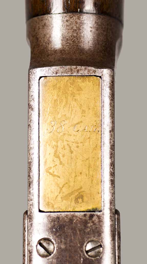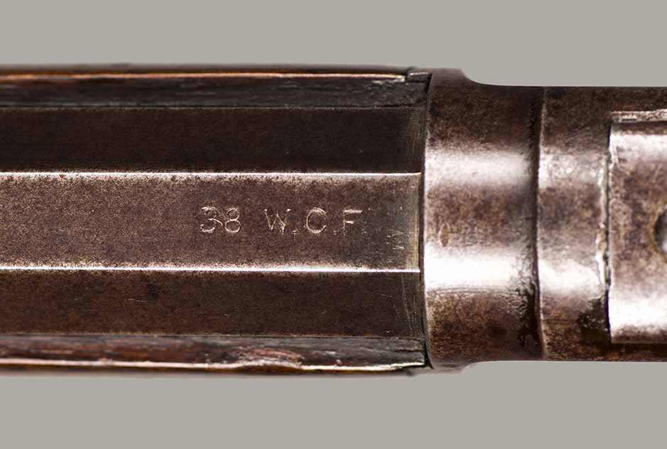 #386249B. Cal 38-40 WCF. Third Model. 24"inch octagonal barrel Rifle. Rifle retains about 30% overall original blue, the balance is a nice brown patina.Original sights include a German silver blade front and typical sporting rear. Mechanically perfect with a near mint bore. Very nice wood with a few traces of handling and storage. Gun was made in 1890! Total production of the Model 1873 WInchester was 720.609. A rifle in a far above average condition! Very fine! Cartridges shown for information purposes only.