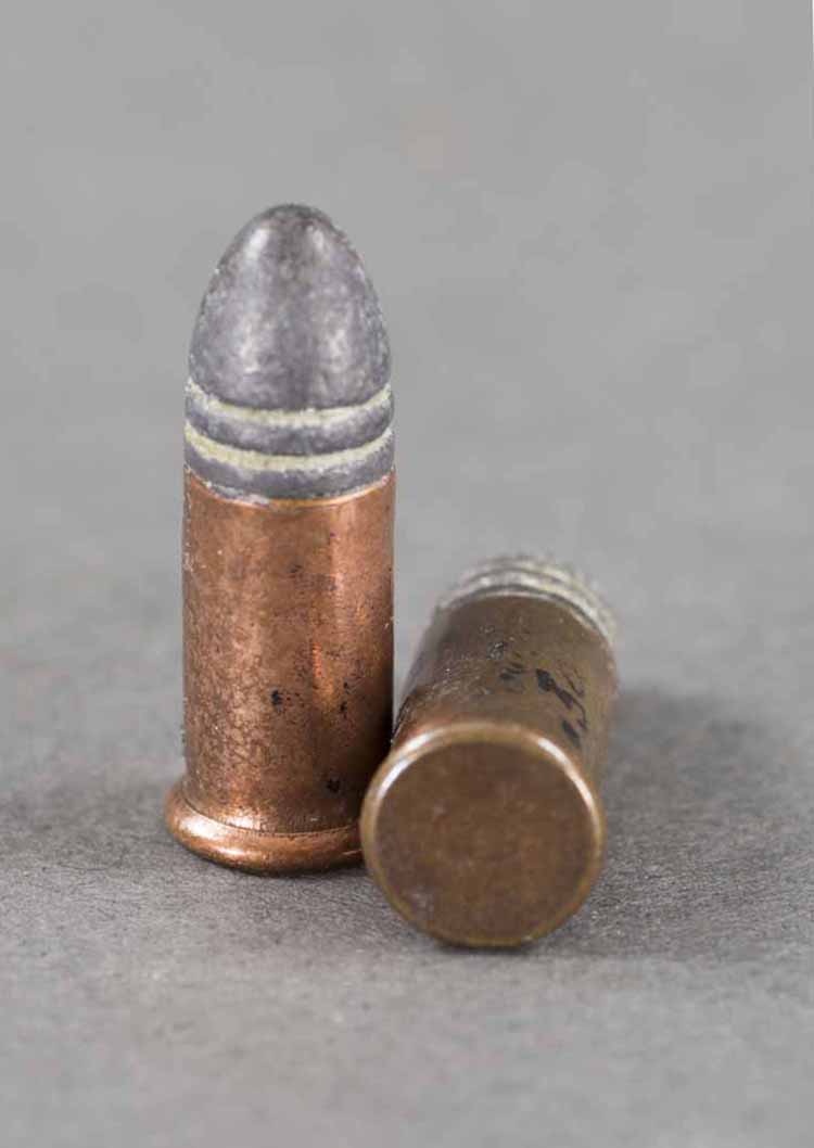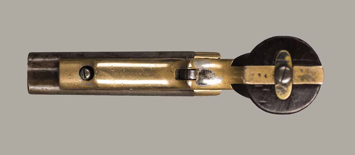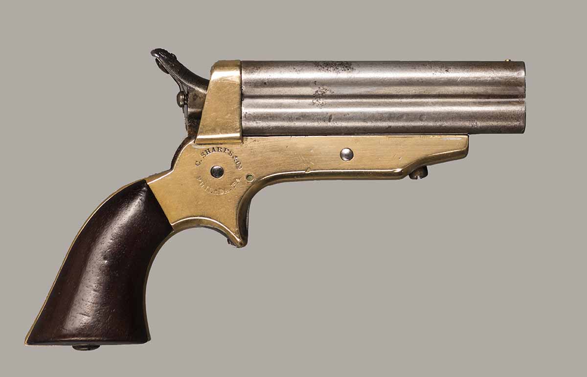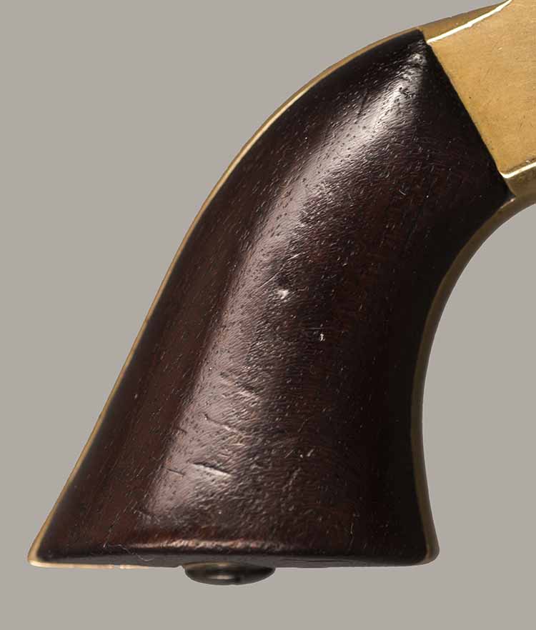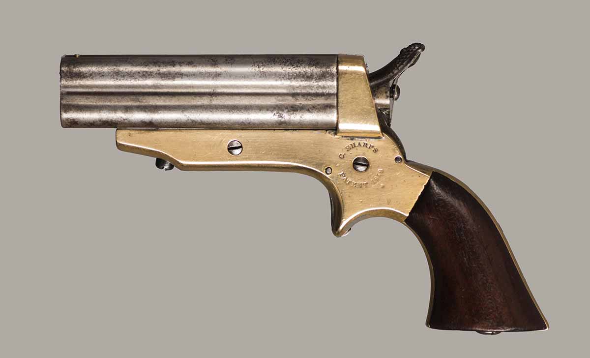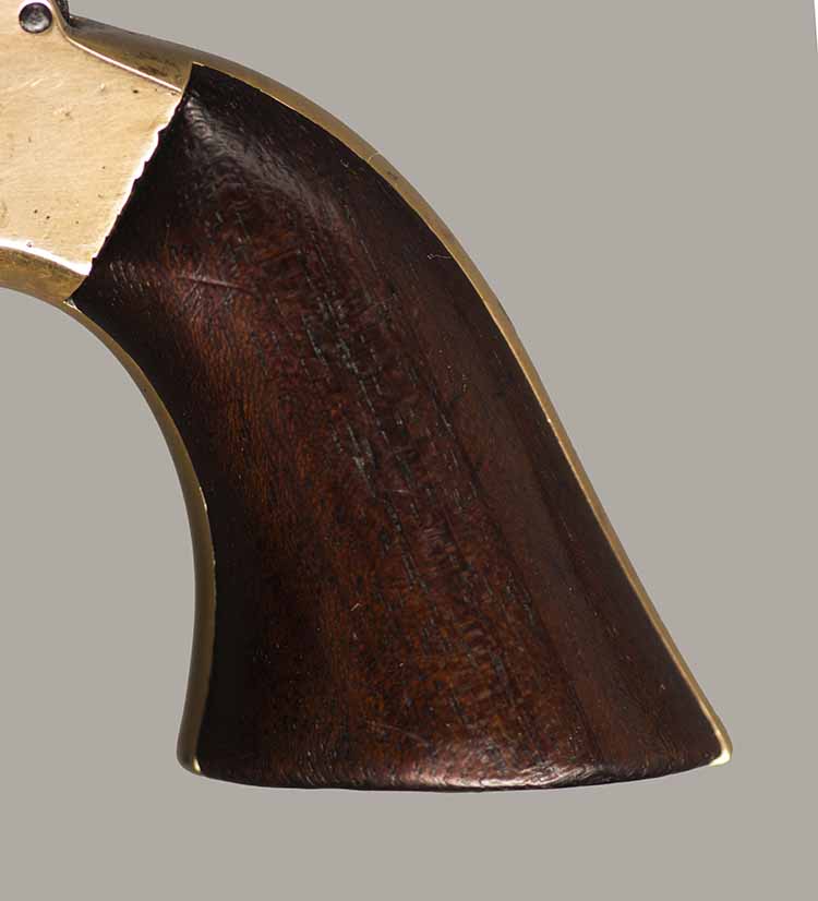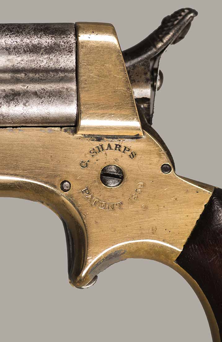 #637. Cal.30 RIm Fire. Rare Model 2E. Standard 3" Barrel. Four shot with rotating firing pin. Has only traces of the original finish remaining. Mechanically perfect. Four very fine bores with excellent rifling. Some light oxidation present. Brass frame and wooden grips in excellent condition. Only around 1000 of these very rare Model 2E pistols were manufactured with a 30 caliber barrel on a 22 caliber frame. All markings are present and serial numbers match. A good looking rare Sharps pistol. Cartridges shown for information purposes only.