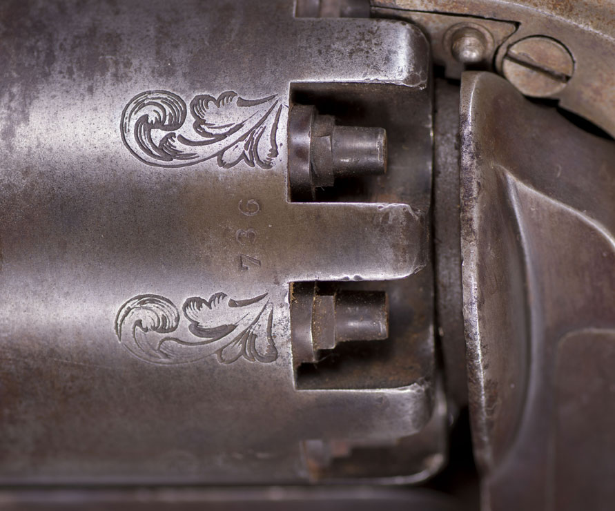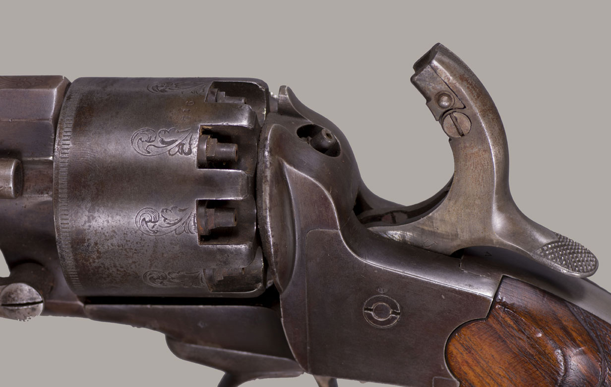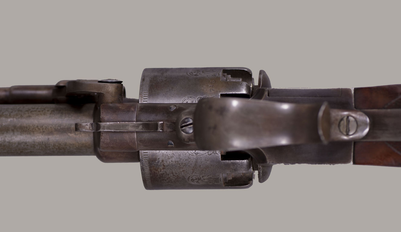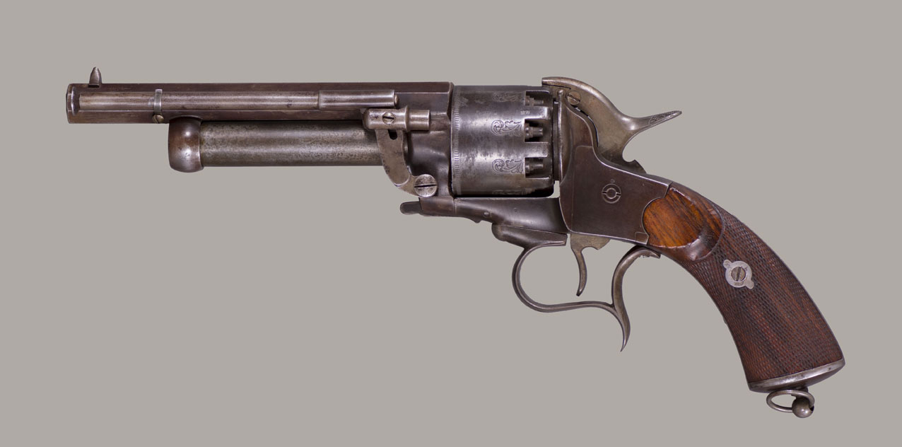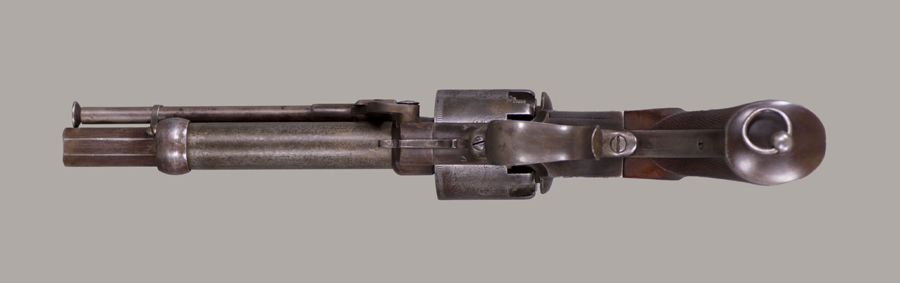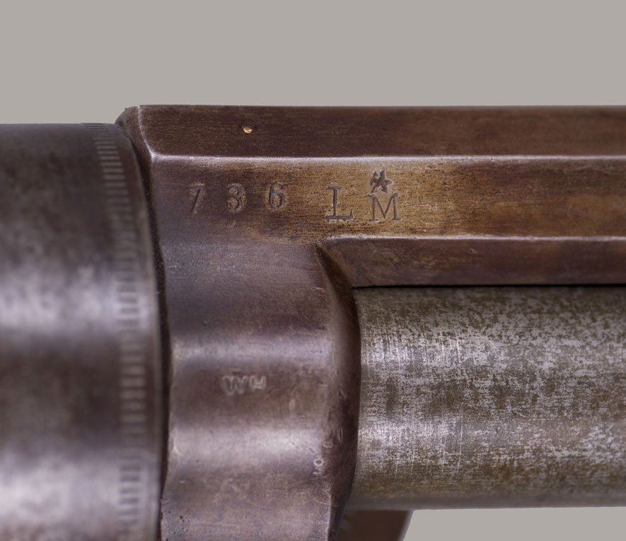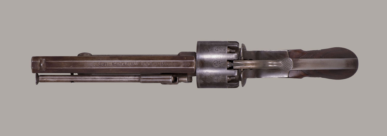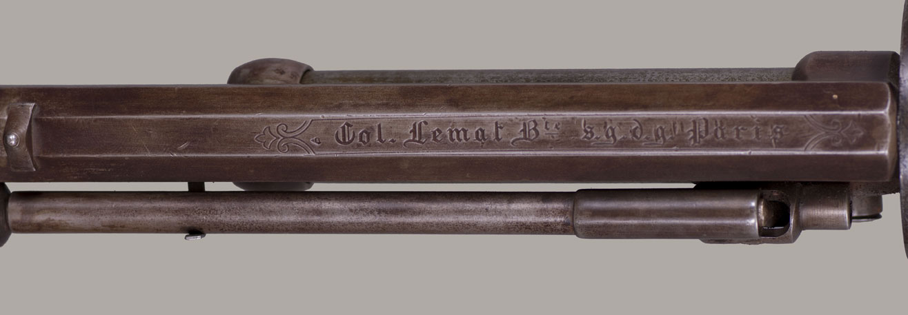 #736. Caliber 42 percussion, 9 shot round cylinder with 6 6/8" barrel, and a 63 caliber (20 gauge for buckshot) 5” barrel. Made by C. Girard in Paris, France from 1861. About 500 transitional revolvers were made and fall between serial numbers 450 and 950. The hammer has a pivoting striker that facilitates firing either the upper or lower barrel. A pivoted loading lever is attached to the left side of the frame and secured along the side of the upper barrel. The grip has an integral flared buttcap with lanyard ring and is fitted with two-piece, fine checkered, European walnut stocks. Top of the barrel is inscribed with the second style Paris marking: "Col. Lemat Bte s.g.d.g. Paris". The right side of the barrel is marked with the LeMat trademark of a five-pointed star above the block letters "LM". The serial number is stamped on the right side of the barrel behind the trademark, on the "engraved" cylinder plus two correct digits on lever. All of the visible serial numbers match. All inspector marks also present and correct. Mechanically perfect. The bore is in excellent condition, so are the cylinder chambers and the shotgun bore! The LeMat was popularly known as the "grapeshot revolver" because of the 20 gauge shot barrel. About 2,900 LeMat revolvers were manufactured between 1856 and 1865, of which 2000 were second models. LeMat revolvers are rare and are very desirable Civil War era revolvers. About 1500 LeMat revolvers were purchased by the Confederate government during the Civil War. LeMat revolvers were carried by prominent Confederate officers such as General J.E.B. Stuart and General P.G.T. Beauregard. The LeMat two-barrel revolver is the most distinctive of all Confederate associated firearms. This revolver was made in 1862. An essentially all original and complete example of a scarce and desirable gun. Fine condition!! We have never had a better one!
