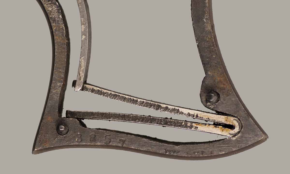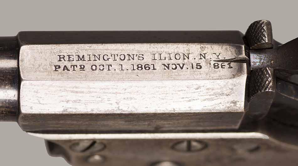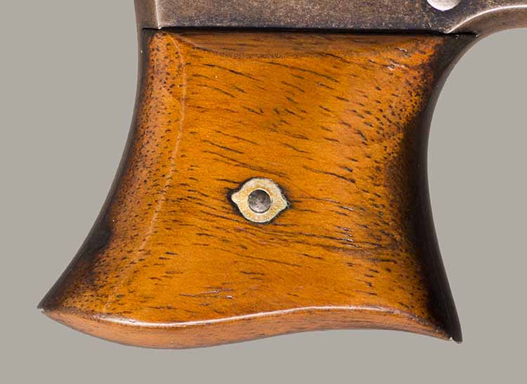 #3857. Cal. 41 Short Rim Fire. Single shot. 4" Barrel. Model No. 3, also called "Saw Handle Deringer". Blue finish. 80% of the original finish remains. 3 numbers of serial number 857 present under barrel, full #3857 on the frame under the grips. Mechanically ??? Bore ??? Walnut grips in excxellent condition. Quantity estimated around 14.000. Manufactured from1864 untill the late 1870's when the production ended. This pistol was probably made in the "early" 1870's. Very fine condition. Cartridges shown for information purposes only.