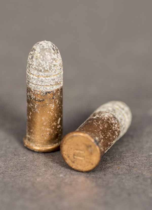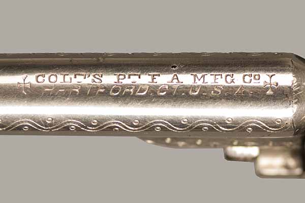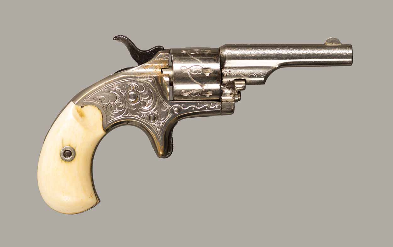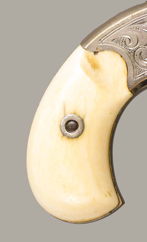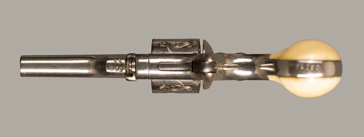 #75093. Cal. 22 RF. 2-3/8" Barrel. 7 Shot. "Factory engraved" with ivory grips! Retains 97% of original silver plated finish, 90% blue on hammer. Mechanically perfect, has an excxellent bore and 7 bright chambers in the cylinder. The majority of factory engraved pocket revolvers were fitted with pearl or ivory grips. Fourth type of barrel marking. Matching serial numbers. Made in 1875. Total production of 114.200. Beautiful and difficult to find gun in excellent+ condition! Cartridges shown for information purposes only.
