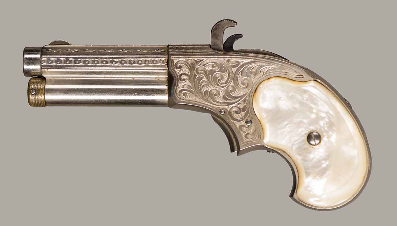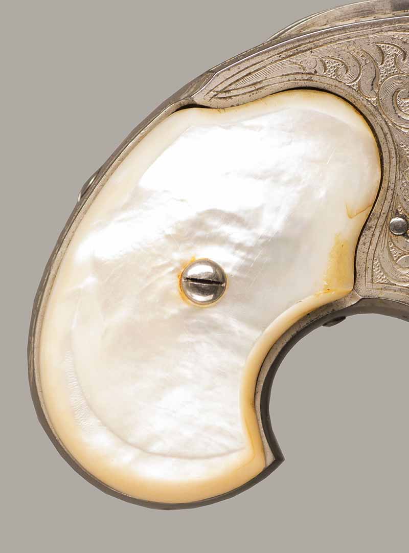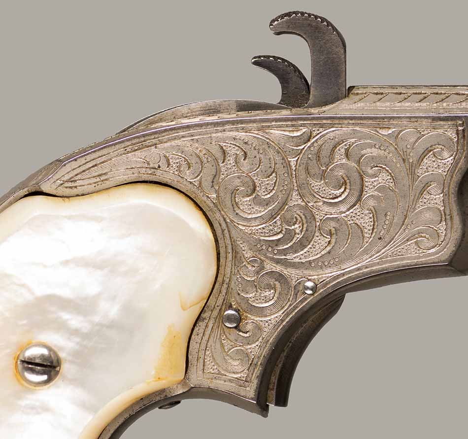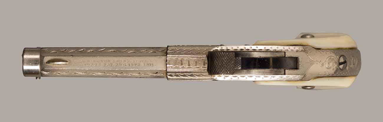 This model was not serial-numbered. Cal.32 RF Extra Short. 5 Shot. 3" Octagon Barrel. The gun is "fully factory" engraved and has special order "thick pearl grips" in new condition. Retains 99% of original overall finish. 5 shot magazine located under the barrel. Mechanically perfect and has a bright shiny bore. This Joseph Rider invention is one of the most unusual of 19th. century pocket pistols and one of the first metallic cartridge weapons using a tubular magazin. Total production of about 13.000, manufactured from 1871 to 1888. Yearly production for this model is not known. Near mint condition! Almost impossible to improve! Great looking gun. Cartridges shown for information purposes only.