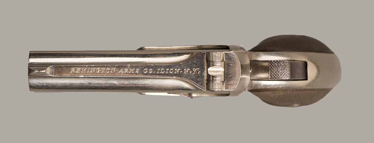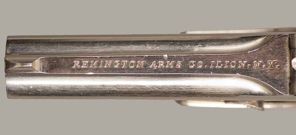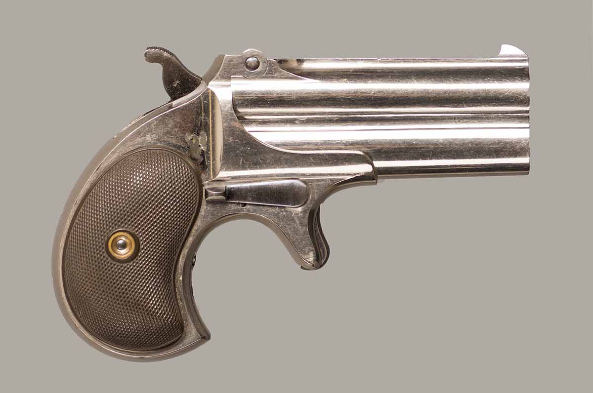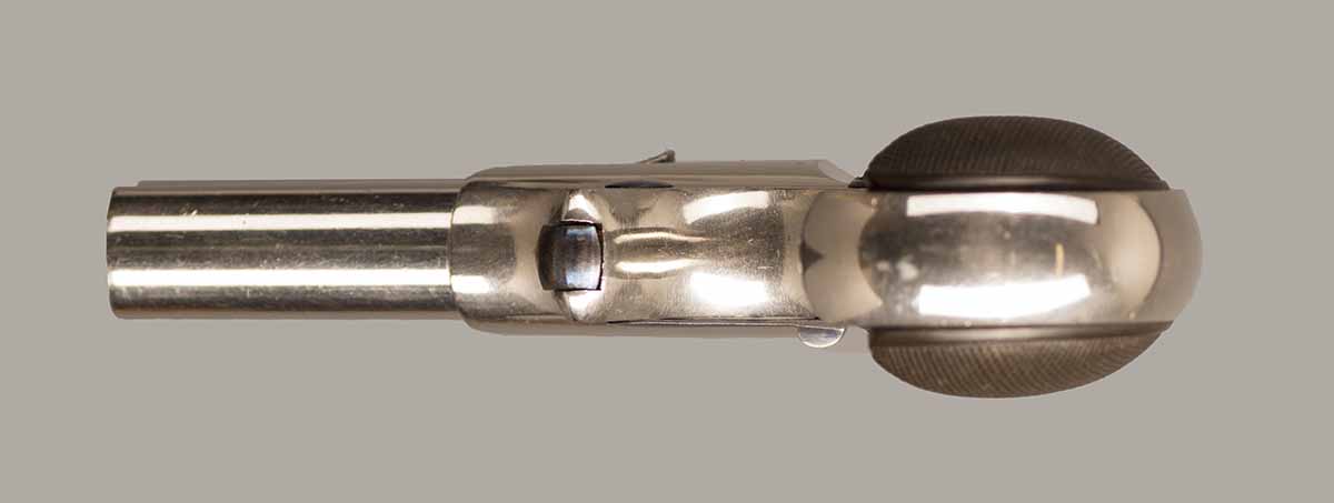 #561. Cal. 41 Rimfire. Standard 3" Barrel. Third Model. Slanted line barrell address! Retains 99% of the original nickel plated finish. Hammer has 98% blue. Correct and perfect black checkered hard rubber grips. Matching serial numbers! Mechanically perfect, bores are excellent. Gun has perfect hinges! Made cc.1888. About 67.000 to 70.000 made. Beautifull deringer in a near mint condition. Would be hard to improve! Cartridges shown for information purposes only.