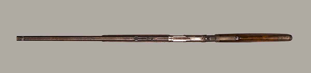 #386249B. Cal 38-40 WCF. Third Model. 24"inch octagonal barrel Rifle. Rifle retains about 30% overall original blue, the balance is a nice brown patina.Original sights include a German silver blade front and typical sporting rear. Mechanically perfect with a near mint bore. Very nice wood with a few traces of handling and storage. Gun was made in 1890! Total production of the Model 1873 WInchester was 720.609. A rifle in a far above average condition! Very fine! Cartridges shown for information purposes only.