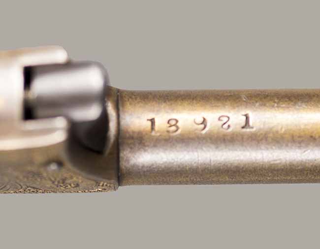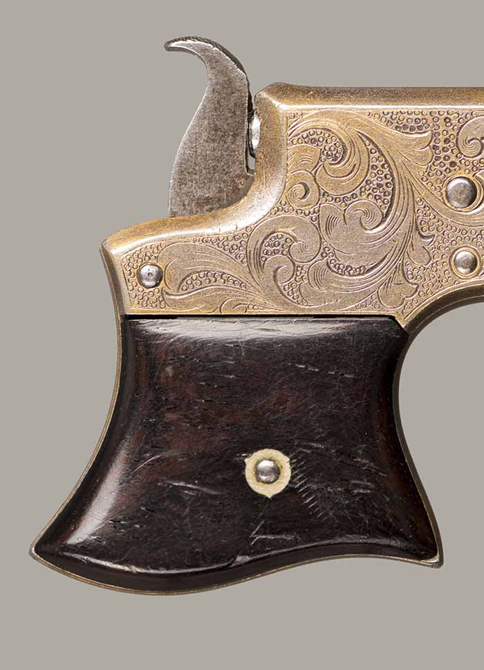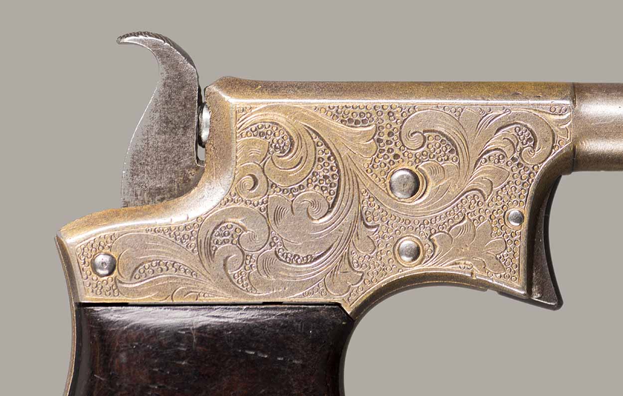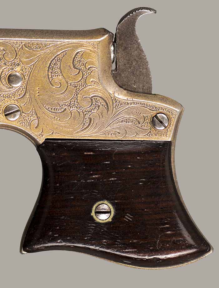 #13921. Cal. 22 Short Rim Fire. Single shot. 3 1/4 " Barrel. Model No.1 Vest Pocket, also called "Saw Handle Deringer". Factory engraved, gold gilded finish. 90% of the original finish is remaining. This type is very rarely seen engraved and gold gilded. Engraving features delicate floral bouquets on each side. Sharp markings. Mechanically perfect, rosewood grips in excellent condition. Bore is excellent. A total production of about 17.000 to 20.000, manufactured between 1863 and 1888. Excellent overall condition. Cartridges shown for information purposes only.