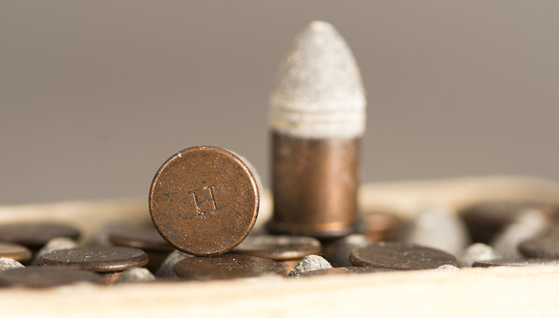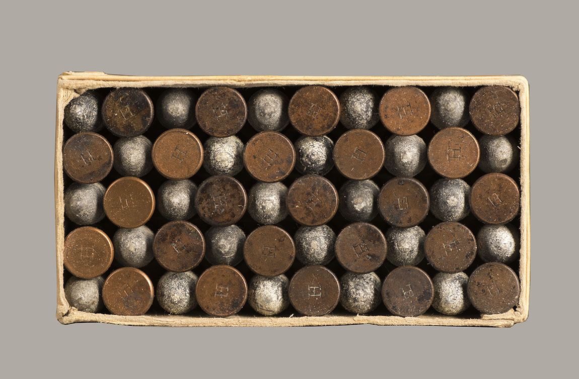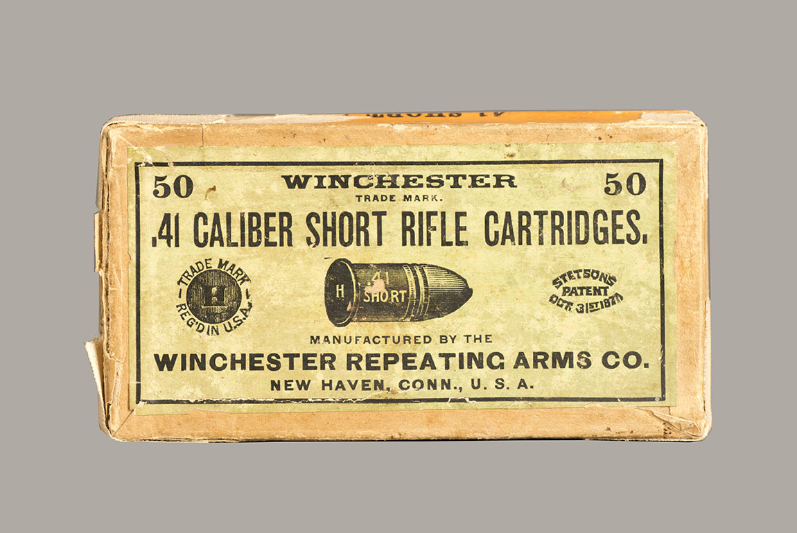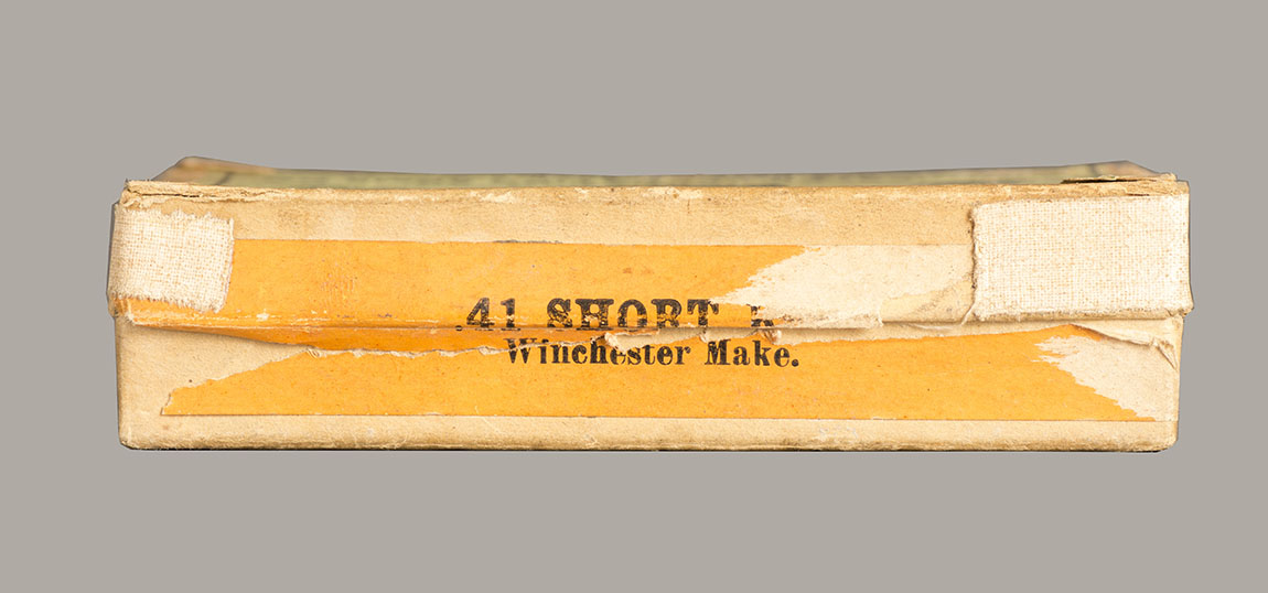 Box of 50 WInchester Caliber 41 Rimfire Short "Rifle" Cartridges. The word "Rifle" was necessary to avoid pistol caliber taxes imposed by a number of states at various times from the 1880s through WW1! While showing some obvious "shelf wear" and has taped lid corners, it remains full of correct large impressed "H" headstamped cartridges. The rounds have original patina.
