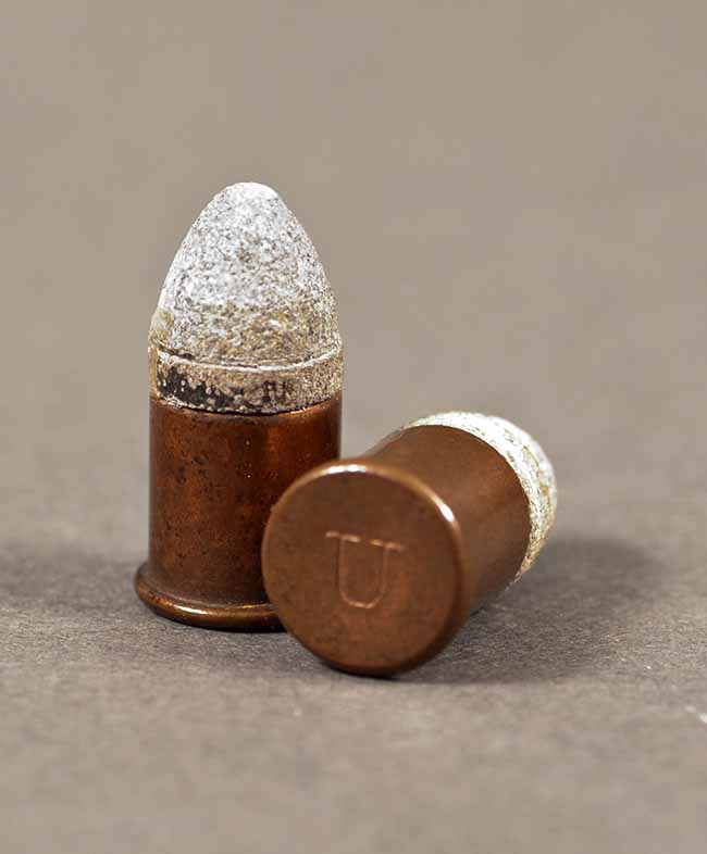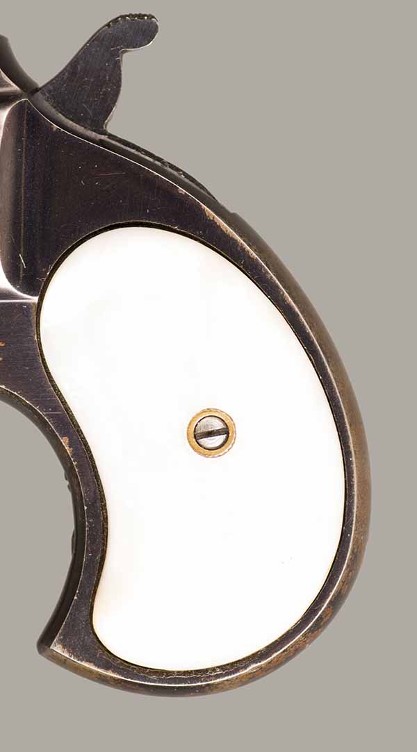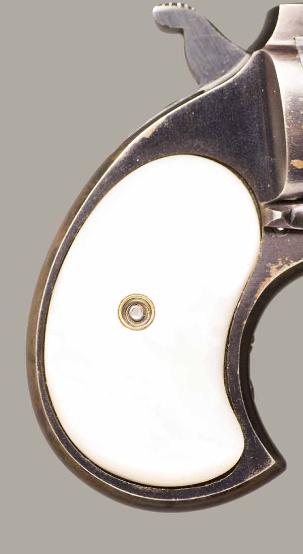 #54. Cal. 41 Rimfire. Standard 3" Barrel. Third Model, third type. Long line signing barrell address! Retains 90% of the original blue finish. Hammer has 98% blue. Correct and perfect pearl grips! Matching serial numbers! Mechanically perfect, bores are excellent. Gun has perfect hinges! Made cc.1888. About 67.000 to 70.000 made. Beautifull deringer in excellent + condition. Cartridges shown for information purposes only.